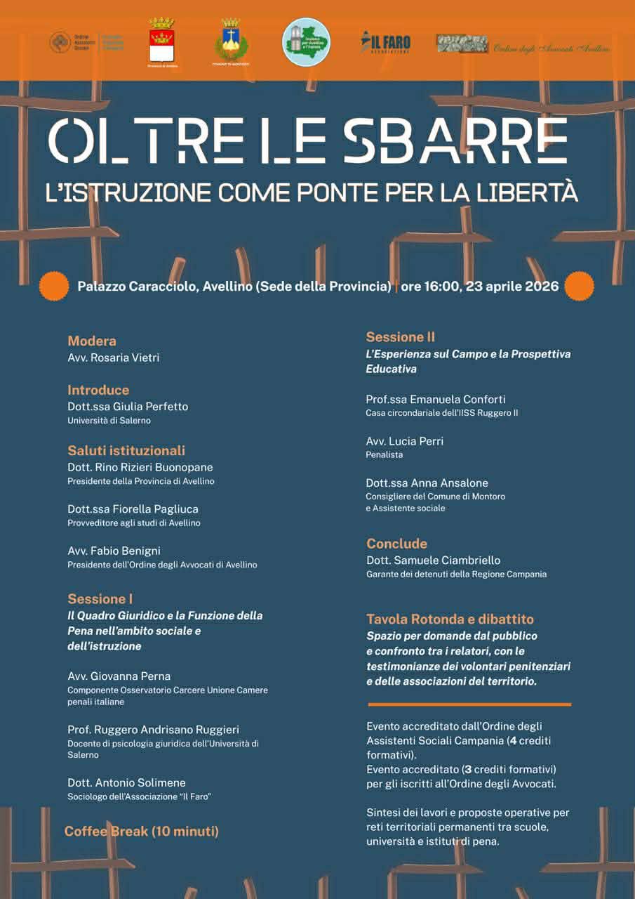 Convegno “Oltre le Sbarre: l’Istruzione come ponte per la Libertà”, – Il 23 aprile 2026, presso Palazzo Caracciolo di Avellino, sede della Provincia, si svolgerà il convegno “Oltre le Sbarre: L’Istruzione come Ponte per la Libertà”, organizzato dalla Dottoressa Giulia Perfetto dell’Università di Salerno.