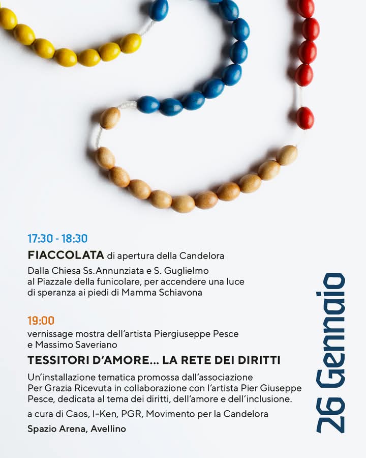 La fiaccolata dalla chiesa dell’Annunziata e San Guglielmo al piazzale della Funicolare di Mercogliano, inaugurerà il cartellone: appuntamento il 26 gennaio. Un corteo che richiama il messaggio di solidarietà e condivisione del Giubileo e si fa monito contro ogni forma di guerra. Alle 19, nello Spazio Arena di Avellino, sarà inaugurata la mostra dell’artista Piergiuseppe Pesce e di Massimo Saveriano “Tessitori d’amore…la rete dei diritti”, installazione promossa dall’associazione “Per Grazia Ricevuta” in collaborazione con Piergiuseppe Pesce sul tema dell’amore senza confini.