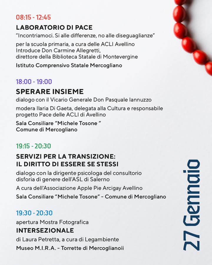 Il 27 gennaio, in occasione della Giornata della Memoria, la Candelora accoglierà, presso l’Istituto Comprensivo Statale di Mercogliano, il Laboratorio di Pace “Incontriamoci. Sì alle differenze, no alle diseguaglianze” a cura delle ACLI di Avellino con la partecipazione di don Carmine Allegretti, direttore della Biblioteca Statale di Montevergine.