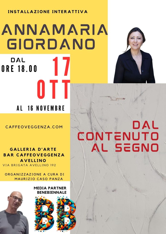 Installazione Interattiva -:Avellino, 16 ottobre 2024 – Siamo lieti di annunciare la presentazione dell’installazione interattiva dell’artista Annamaria Giordano, che si terrà domani, 17 ottobre, alle ore 18.00 presso il Bar Caffeoveggenza di Avellino.