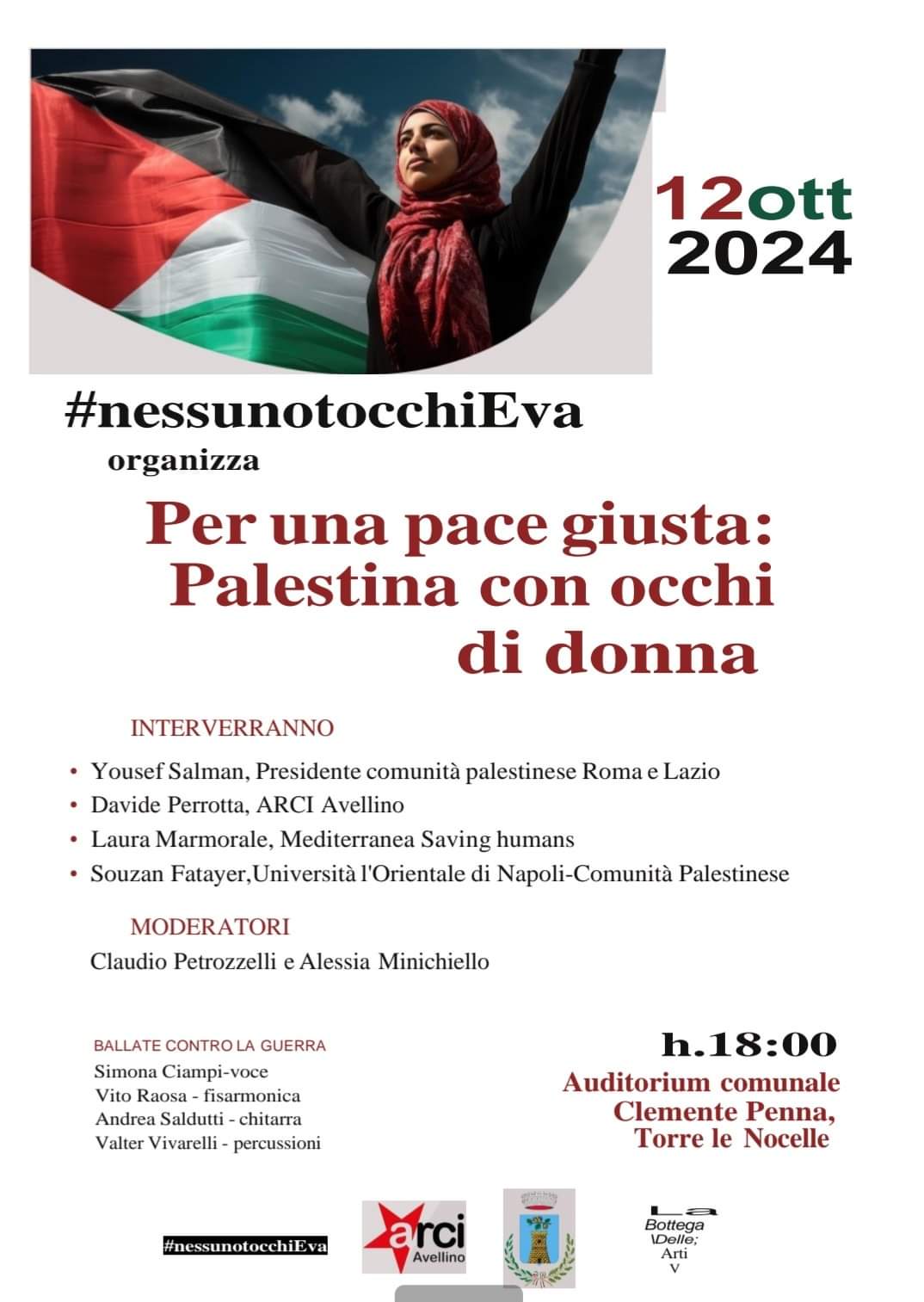 A un anno dall’attentato di Hamas, l’associazione #nessunotocchiEva organizza l’incontro dal titolo “Per una Pace giusta: Palestina con occhi di donna”, che si terrà sabato 12 ottobre 2024, alle ore