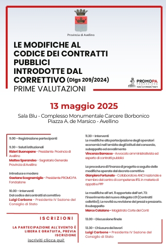 “Le modifiche al codice dei contratti pubblici introdotte dal correttivo (Dlgs 209/2024). Prime valutazioni”: è il tema del convegno formativo in programma martedì prossimo – 13 maggio – presso la Sala Blu del Complesso Monumentale Carcere Borbonico di Avellino. La giornata formativa è organizzata dalla Provincia di Avellino con PromoPa Fondazione.
