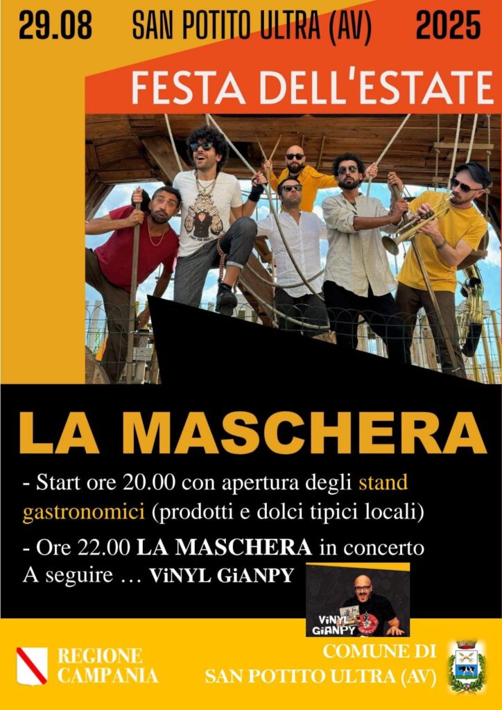 SAN POTITO ULTRA, IL SINDACO PORFIDO: “LA FESTA DELL’ESTATE E’ COMUNITA’, MUSICA E CONDIVISIONE” – Attesa nel comune irpino per il concerto de La Maschera San Potito Ultra, 25 ago – Venerdì 29 agosto il centro di San Potito Ultra si accenderà con la Festa dell’Estate 2025, un evento atteso che unisce musica, tradizione e convivialità. A partire dalle 20.00 sarà possibile immergersi nei sapori tipici locali grazie agli stand gastronomici con prodotti e dolci della tradizione campana. Alle ore 22.00 il palco ospiterà ‘La Maschera’, una delle band più importanti e originali del panorama musicale partenopeo, capace di fondere sonorità popolari e mediterranee con testi che raccontano l’amore, la fiducia nel prossimo e la forza di superare le avversità. Una musica che nasce da Napoli e parla un linguaggio universale, coinvolgendo pubblici di ogni età. La serata proseguirà con l’energia e il ritmo trascinante di Vinyl Gianpy, per continuare a ballare e cantare fino a tarda notte. La Festa dell’Estate di San Potito Ultra è organizzata dal Comune di San Potito Ultra, con il patrocinio della Regione Campania.