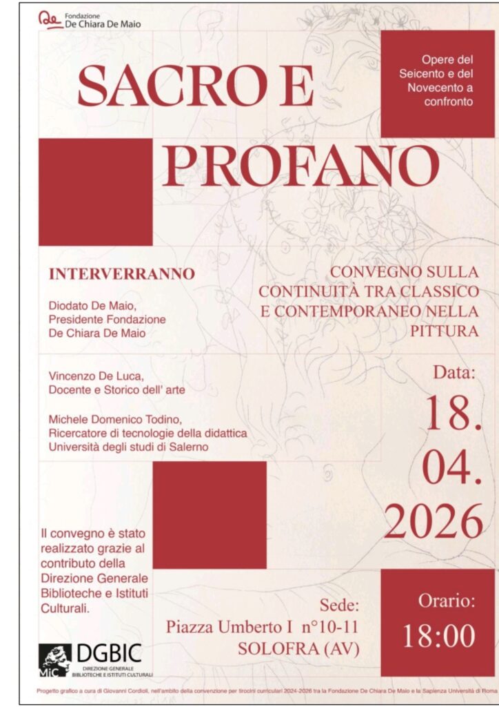 Solofra – SACRO E PROFANO – Convegno sulla continuità tra classico e contemporaneo nella pittura – Solofra (AV), 18 aprile 2026 – La Fondazione De Chiara De Maio promuove il convegno Sacro e profano, in programma sabato 18 aprile alle ore 18:00 presso la sede operativa di Solofra (AV), in Piazza Umberto I n. 10-11.