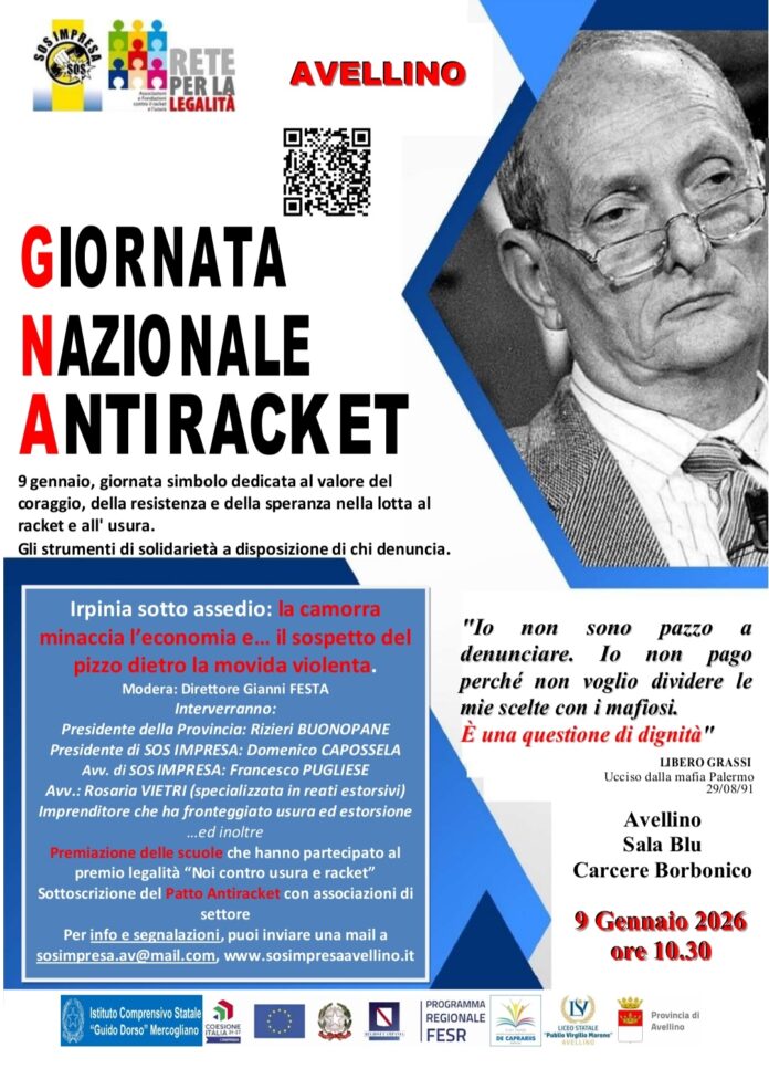 Sos Impresa Avellino, il 9 gennaio la Giornata Nazionale Antiracket: riflettori su usura, racket e movida violenta. – Avellino torna a interrogarsi sul peso di usura ed estorsioni sull’economia locale. Giovedì 9 gennaio, nella Sala Blu del Carcere Borbonico, si celebra la Giornata Nazionale Antiracket, un appuntamento sobrio ma carico di significato, dedicato alla difesa della legalità e al sostegno di chi sceglie di non piegarsi ai ricatti criminali. L’iniziativa è promossa da SOS Impresa – Rete per la Legalità e pone al centro un tema di forte attualità: “Irpinia sotto assedio: la camorra minaccia l’economia e il sospetto del pizzo dietro la movida violenta”. Un confronto che punta a leggere i segnali di una pressione criminale spesso silenziosa, ma capace di incidere profondamente sul tessuto produttivo e sociale del territorio.