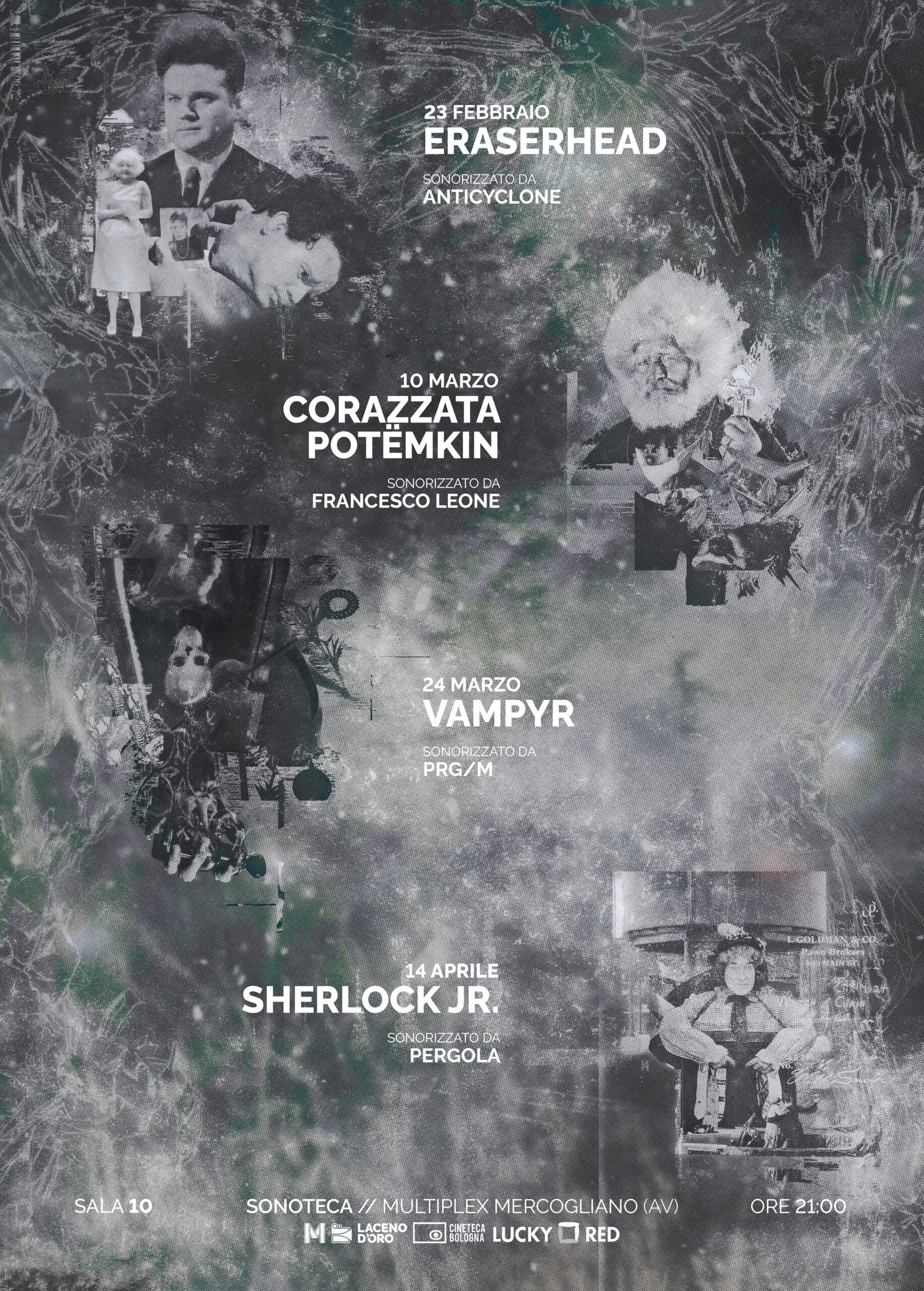Tornano gli appuntamenti Sonoteca: quattro capolavori del cinema sonorizzati dal vivo in chiave contemporanea – Film d’autore e sperimentazione musicale per un percorso immersivo che stupirà lo spettatore, in programma al Multiplex di Mercogliano. Una rassegna che intreccia film d’autore e sperimentazione sonora, capace di restituire alle immagini una vibrazione contemporanea.Ritornano gli appuntamenti targati Sonoteca che, in collaborazione con il Laceno d’Oro International Film Festival, accompagneranno il pubblico in un percorso immersivo dove quattro capolavori della storia del cinema saranno reinterpretati dal vivo al cinema Multiplex di Mercogliano, attraverso nuove sonorizzazioni elettroniche.Si parte il 23 febbraio, con il sostegno della distribuzione di Lucky Red, con Eraserhead (1977) di David Lynch, un racconto visionario in cui il tipografo Henry Spencer vive isolato in uno squallido appartamento tra allucinazioni e incubi, fino alla scoperta di essere padre di una creatura enigmatica che lo trascina in una spirale di disperazione dove sogno e realtà si confondono. A rileggerlo dal vivo sarà il duo elettronico Anticyclone, progetto orientato tra Melodic House e Techno e caratterizzato da una costante ricerca di immersione sonora capace di connettere musica e spazio. Gli altri appuntamenti proseguono con il sostegno della Cineteca di Bologna. Il 10 marzo è in programma La corazzata Potëmkin (1925) di Sergej Michajlovič Ėjzenštejn, tra i film più celebri e influenti di sempre, presentato in uno straordinario restauro che restituisce la potenza del racconto della rivolta dei marinai e della città di Odessa del 1905 e l’impeto creativo di un giovane regista destinato a rivoluzionare il linguaggio cinematografico. La sonorizzazione sarà a cura di Francesco Leone, attivo da oltre vent’anni nella scena musicale di ricerca, cofondatore della label techno Camera Magmatica e autore di selezioni che attraversano new wave, post-punk, EBM ed elettronica sperimentale. Il viaggio continua il 24 marzo con Vampyr (1932) di Carl Theodor Dreyer, liberamente ispirato ai racconti di Sheridan Le Fanu e ambientato in un crepuscolo sospeso tra nebbie, presenze invisibili, ombre ambigue e misteriose morti che il giovane protagonista dovrà affrontare per trionfare sull’occulto. Ad accompagnarlo, le architetture sonore di PRG/M, progetto musicale di Pier Giuseppe Mariconda, che esplora manipolazioni ritmiche, micro-variazioni e profondità ambient in dialogo con la tensione techno.