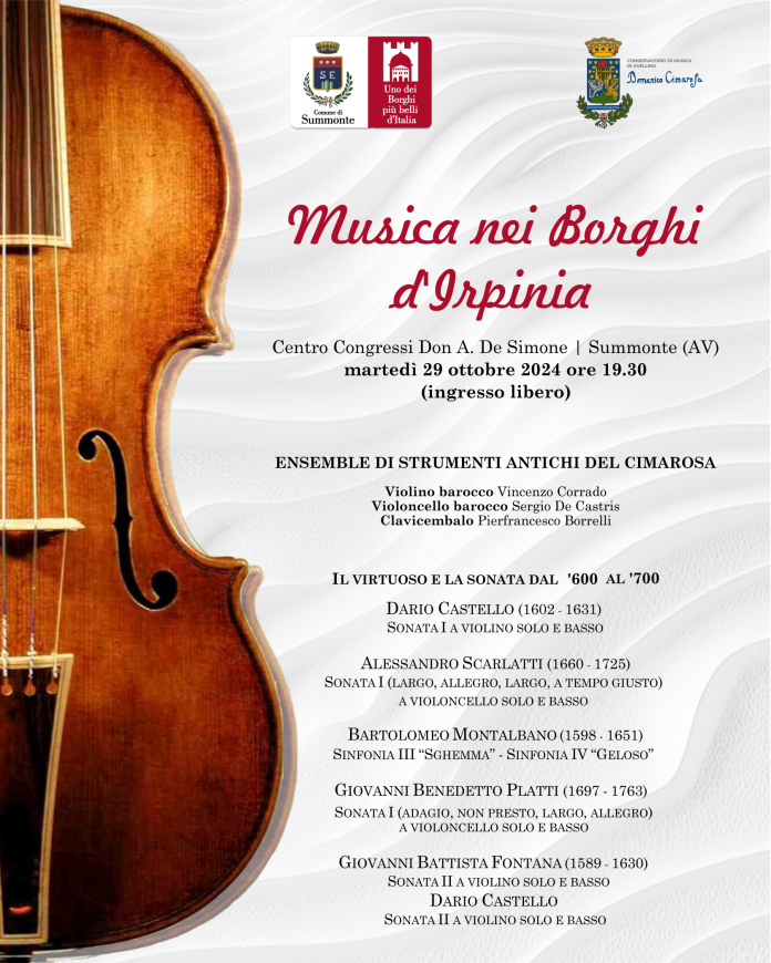 Summonte si prepara ad accogliere un evento musicale di grande prestigio. Martedì 29 ottobre, alle ore 19.30, il Centro Congressi Don Alberto De Simone sarà il palcoscenico del concerto “Musica nei Borghi d’Irpinia“, realizzato in collaborazione con il Conservatorio Domenico Cimarosa di Avellino.