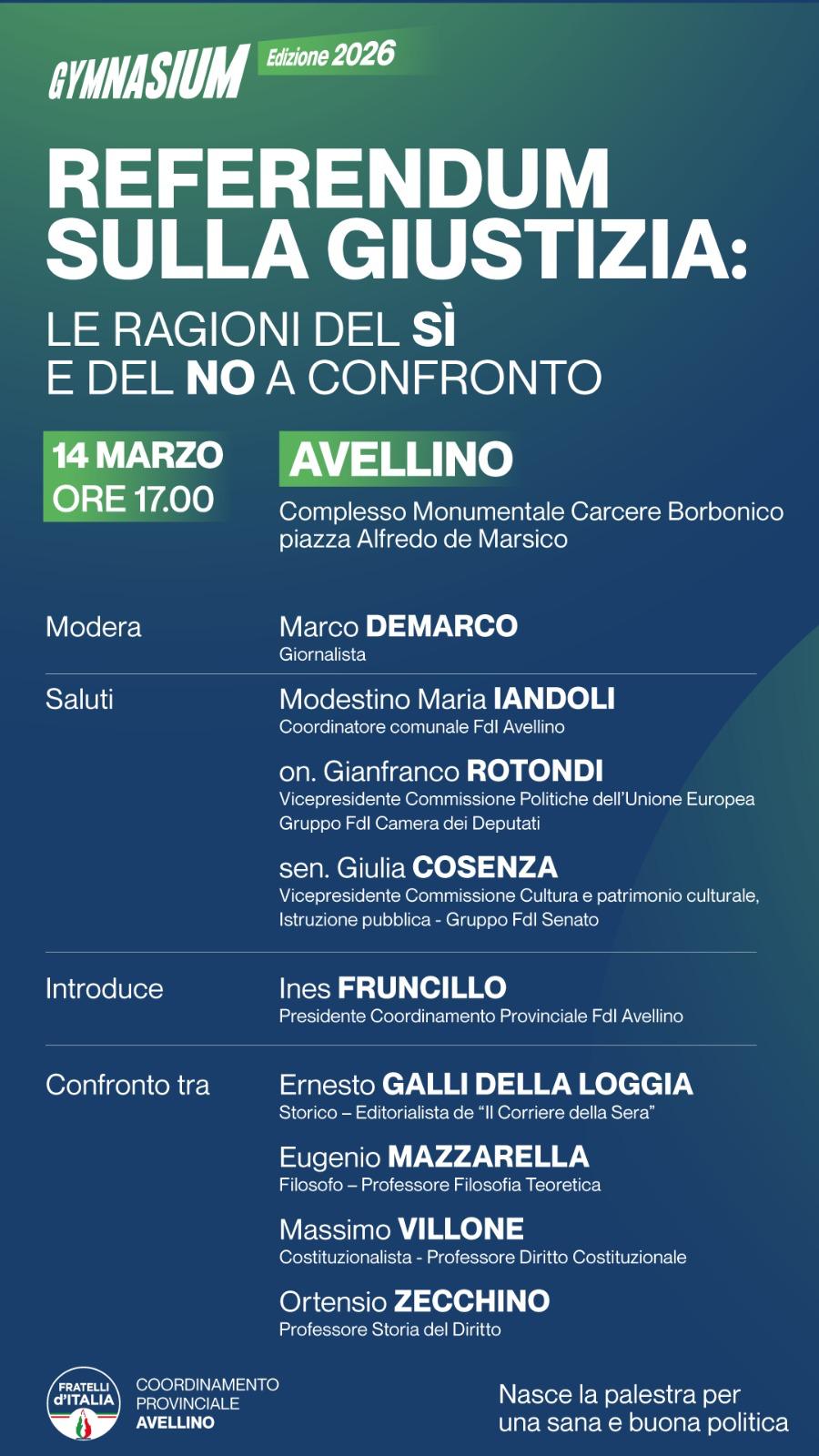 Un compito difficile che può essere svolto valorizzando il confronto e la partecipazione, perché solo in questo modo è possibile affrontare con serietà e rigore i temi cruciali per il presente e per il futuro dell’Italia. Solo senza improvvisazione e possibile far crescere una classe dirigente capace di interpretare le sfide del nostro tempo”. Il primo appuntamento della rassegna si terrà sabato 14 marzo alle ore 17.00 presso il Complesso Monumentale del Carcere Borbonico di Avellino (Piazza Alfredo De Marsico) e sarà dedicato al tema:“Referendum sulla giustizia: le ragioni del sì e del no a confronto”. L’incontro sarà moderato dal giornalista Marco Demarco. Porteranno i saluti Modestino Maria Iandoli, coordinatore cittadino di Fratelli d’Italia Avellino, l’on. Gianfranco Rotondi, vicepresidente della Commissione Politiche dell’Unione Europea della Camera dei Deputati, e la sen. Giulia Cosenza, vicepresidente della Commissione Cultura e Istruzione pubblica del Senato. I lavori saranno introdotti da Ines Fruncillo, Presidente del Coordinamento Provinciale di Fratelli d’Italia Avellino.Il confronto vedrà la partecipazione di autorevoli studiosi e intellettuali: Ernesto Galli della Loggia, storico ed editorialista del Corriere della Sera, Eugenio Mazzarella, filosofo e professore di Filosofia teoretica, Massimo Villone, costituzionalista e professore di Diritto costituzionale, e Ortenzio Zecchino, professore di Storia del diritto. L’iniziativa si propone di offrire un confronto libero, plurale e di alto profilo culturale, nel quale possano emergere, con serietà e rigore, le diverse posizioni sul tema della riforma della giustizia e del referendum.“Gymnasium” rappresenta l’avvio di un percorso più ampio di incontri e momenti di approfondimento che il Coordinamento Provinciale di Fratelli d’Italia intende promuovere nei prossimi mesi per alimentare nel territorio irpino una discussione pubblica qualificata sui grandi nodi istituzionali, economici e culturali. Perché una buona politica nasce sempre dalla forza delle idee, dalla libertà del confronto e dalla responsabilità di chi ha il coraggio di mettersi in gioco per il bene della comunità.