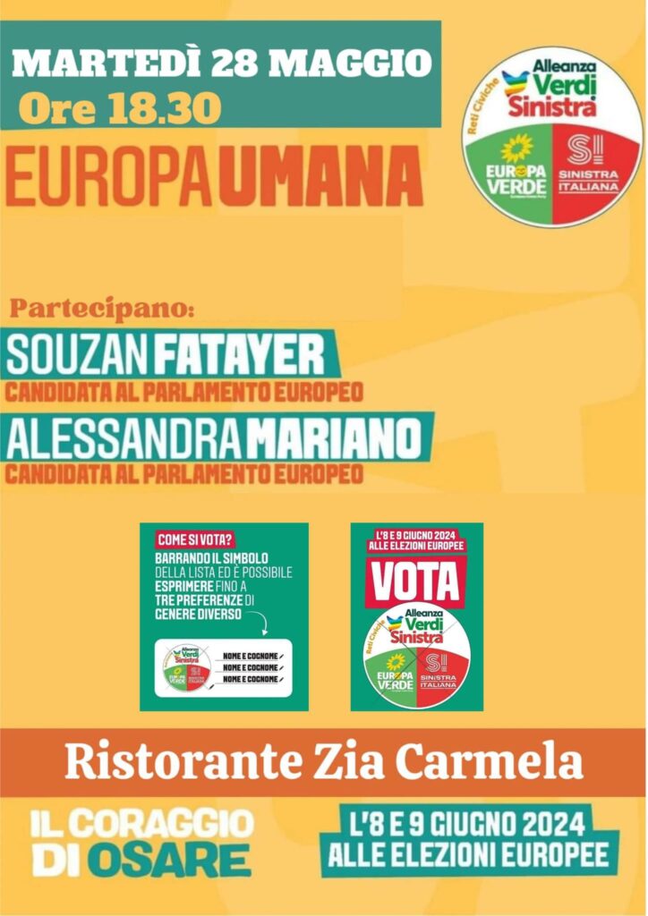 Il 28 Maggio 2024, alle ore 18.30, presso il Ristorante Zia Carmela, il Circolo di Sinistra Italiana di Montella “E. Berlinguer” organizza un incontro con le candidate al Parlamento europeo, appartenenti alla Circoscrizione Sud, per l’Allenza Verdi Sinistra Italiana, Alessandra Mariano e Souzan Fatayer.