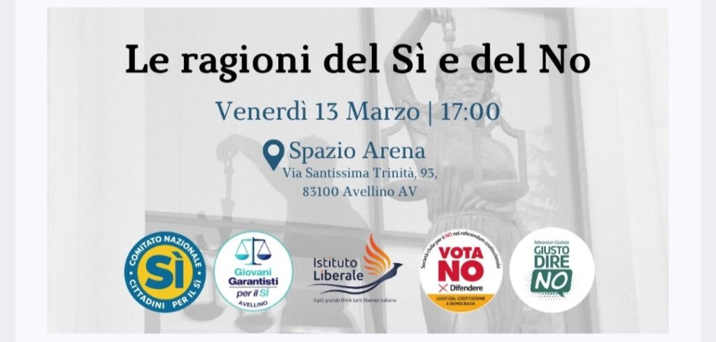 Referendum sulla giustizia: ad Avellino il confronto pubblico “Le ragioni del Sì e del No” – Venerdì 13 marzo alle ore 17:00, presso Spazio Arena in Via Santissima Trinità 93 ad Avellino, si terrà l’incontro pubblico “Le ragioni del Sì e del No”, un momento di confronto e approfondimento dedicato al referendum sulla giustizia. L’iniziativa, promossa dal Comitato Giovani Garantisti per il Sì – Avellino, nasce con l’obiettivo di offrire ai cittadini un’occasione di informazione e dibattito, mettendo a confronto posizioni diverse sul tema della riforma della giustizia. A moderare l’incontro sarà il dott. Franco Genzale, giornalista. L’evento sarà introdotto dal dott. Francesco Pisano, presidente del Comitato Giovani Garantisti per il Sì – Avellino.Sono previsti i saluti dell’avv. Fabio Benigni, presidente dell’Ordine degli Avvocati di Avellino, dell’avv. Gaetano Aufiero, presidente della Camera Penale Irpina, del dott. Raffaele Claudio Aliberti, componente del direttivo nazionale dell’Istituto Liberale, e di Lucia Faretra, presidente del Comitato Giovani Garantisti per il Sì – Valle Ufita.Interverranno come relatori a sostegno delle ragioni del Sì il dott. Giuseppe Visone, sostituto procuratore della DDA di Napoli, l’avv. Mauro Alvino, penalista e componente del direttivo della Camera Penale Irpina, e l’avv. Giuseppe De Gregorio, penalista e Coordinatore Regionale Cittadini per il Sì.A rappresentare le ragioni del No saranno invece il dott. Roberto Nuzzo, segretario della sottosezione ANM di Benevento, l’avv. Ida Iasi, civilista, e l’avv. Raffaele Tecce, penalista e consigliere dell’Ordine degli Avvocati di Avellino.A concludere l’incontro sarà l’on. Gianfranco Librandi, presidente regionale del Comitato Cittadini per il Sì.