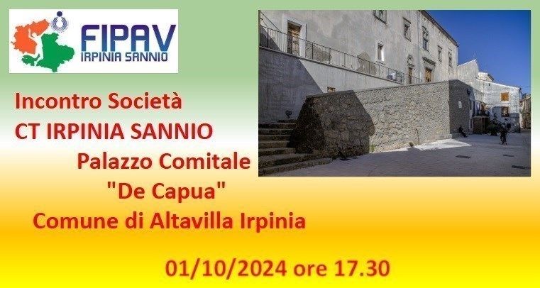 Il giorno 1 ottobre alle ore 18.00 presso il Palazzo Comitale “De Padua” di Altavilla Irpina, si terrà l’annuale incontro delle Società della Federazione Italiana Pallavolo, Comitato Territoriale Irpinia Sannio.L’incontro sarà un momento di confronto per fare il punto sulla precedente stagione conclusasi ed illustrare le novità organizzative, formative e regolamentari della nuova stagione 2025/26.Inoltre saranno consegnati gli Scudetti alle Società vincitrici dei campionati territoriali, i premi agli Allenatori che si sono contraddistinti nei Corsi Allievo e Primo Grado e gli Arbitri promossi al ruolo regionale,