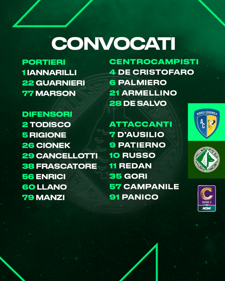 In vista del match tra Audace Cerignola ed Avellino, valido per la ventiduesima giornata del campionato di serie C Now, mister Raffaele Biancolino ha diramato la seguente lista di convocati: