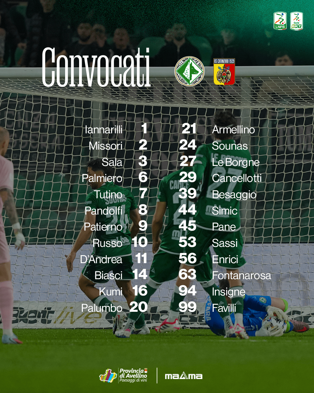 In vista del match tra Avellino e Catanzaro, valido per la trentaquattresima giornata del campionato di Serie BKT, mister Davide Ballardini ha diramato la seguente lista di convocati: