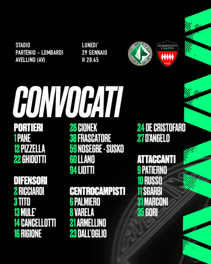 In vista del match tra Avellino e Sorrento, valido per la ventitreesima giornata del campionato di serie C Now, girone C, mister Michele Pazienza ha diramato la seguente lista di convocati:
