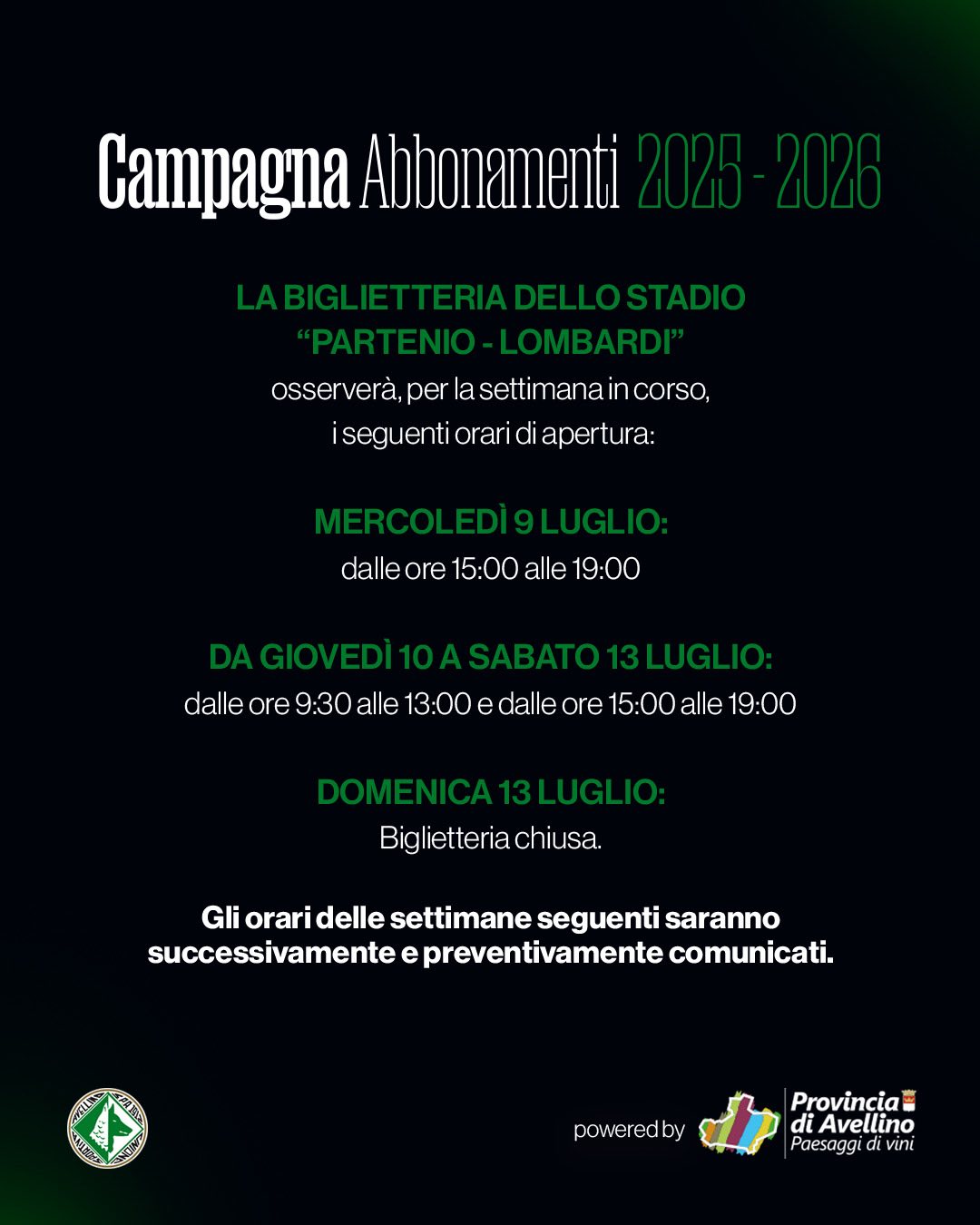 La biglietteria dello Stadio “Partenio – Lombardi” osserverà per la settimana in corso i seguenti orari di apertura: