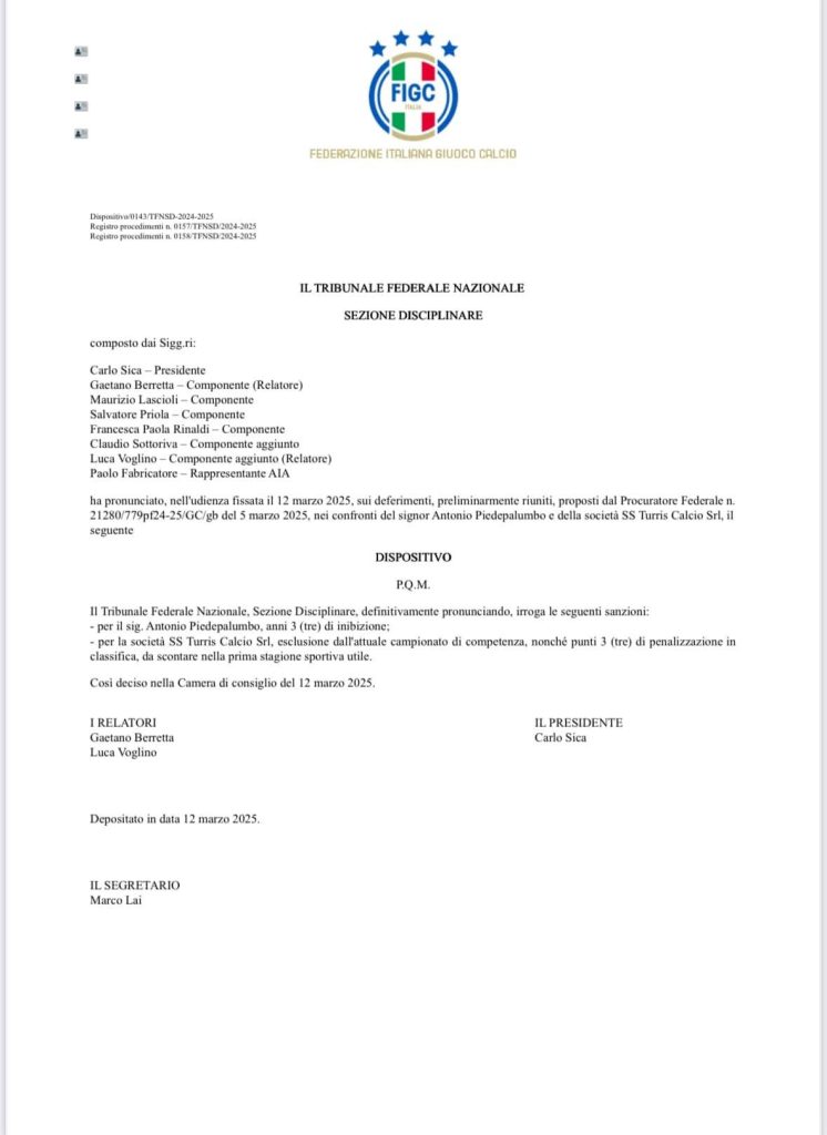 Dopo l’esclusione dal campionato del Taranto il TFN ha sancito per l’esclusione dal campionato di Serie C anche la Turris.