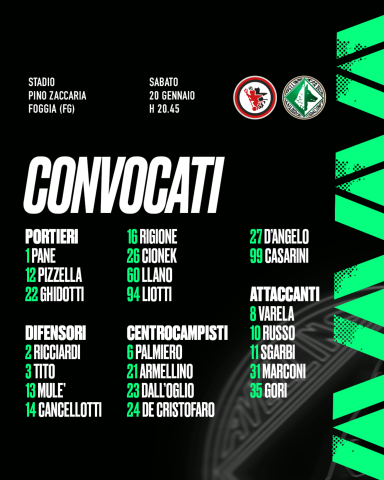 In vista del match tra Foggia ed Avellino, valido per la ventiduesima giornata del campionato di serie C Now, girone C, mister Michele Pazienza ha diramato la seguente lista di convocati: