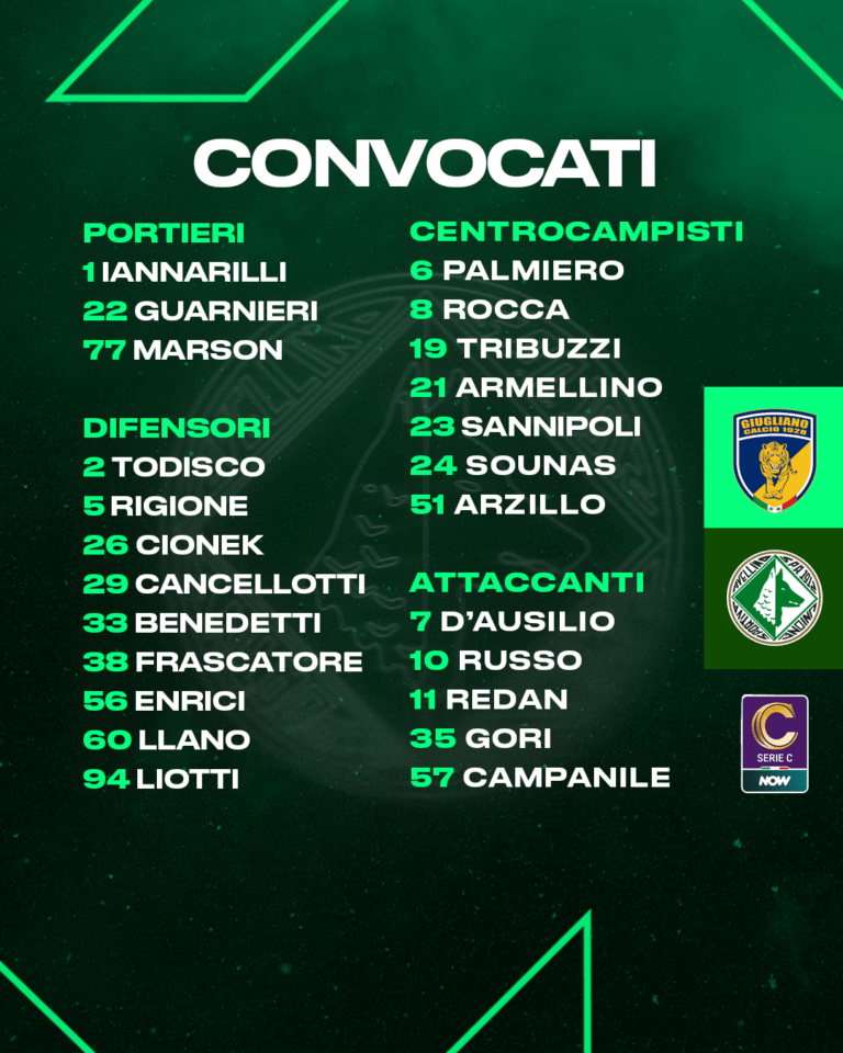 In vista del match tra Giugliano ed Avellino, valido per la ventunesima giornata del campionato di serie C Now, mister Raffaele Biancolino ha diramato la seguente lista di convocati: