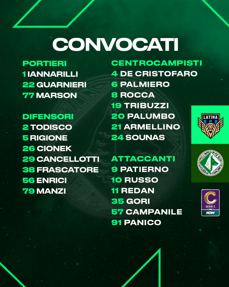In vista del match tra Latina ed Avellino, valido per la ventiquattresima giornata del campionato di serie C Now, mister Raffaele Biancolino ha diramato la seguente lista di convocati: