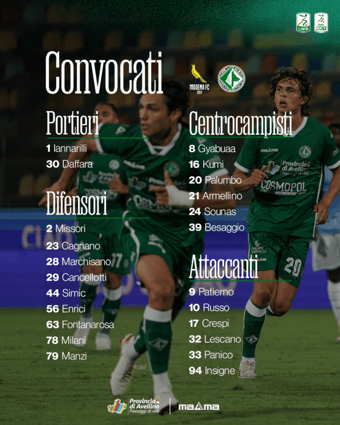 In vista del match tra Modena ed Avellino, valido per la seconda giornata del campionato di Serie BKT, mister Raffaele Biancolino ha diramato la seguente lista di convocati:Portieri: 1 Iannarilli, 30 Daffara; Difensori: 2 Missori, 23 Cagnano, 28 Marchisano, 29 Cancellotti, 44 Simic, 56 Enrici, 63 Fontanarosa, 78 Milani, 79 Manzi;Centrocampisti: 8 Gyabuaa, 16 Kumi, 20 Palumbo, 21 Armellino, 24 Sounas, 39 Besaggio;Attaccanti: 9 Patierno, 10 Russo, 17 Crespi, 32 Lescano, 33 Panico, 94 Insigne.REPORTLuca D’Andrea: dopo aver accusato una dolenza al ginocchio sinistro ha praticato esami strumentali che hanno evidenziato una lesione del corpo del menisco esterno. Si sottoporrà ad intervento chirurgico ad inizio della prossima settimana.Andrea Favilli: è alle prese con il programma post operatorio dopo essersi sottoposto ad intervento chirurgico di resezione ossea.Luca Palmiero: sta proseguendo di allenamento differenziato dopo l’infortunio al polpaccio della gamba sinistra.Pasquale Pane: Dopo aver accusato un fastidio in allenamento ha praticato esami strumentali che hanno evidenziato una lesione distrattiva del musco ileopsoas di sinistra. Ha avviato il programma di riabilitazione.Michele Rigione: ha avviato il programma di allenamento differenziato dopo l’infortunio al soleo.Gennaro Tutino: di concerto con lo staff medico si è preferito non convocarlo in via precauzionale per gestire al meglio il suo pieno ritorno in forma.