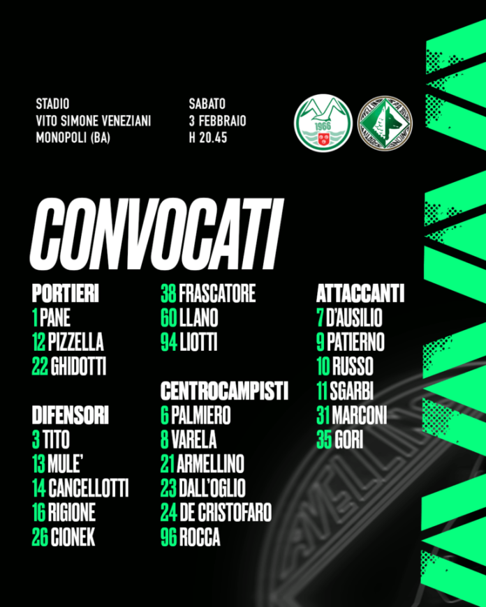 In vista del match tra Monopoli ed Avellino, valido per la ventiquattresima giornata del campionato di serie C Now, girone C, mister Michele Pazienza ha diramato la seguente lista di convocati: