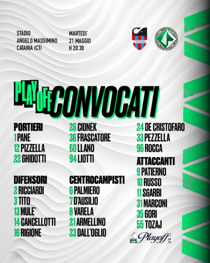 In vista del match tra Catania ed Avellino, valido per l’andata del secondo turno nazionale dei playoff di serie C Now, mister Michele Pazienza ha diramato la seguente lista di convocati: