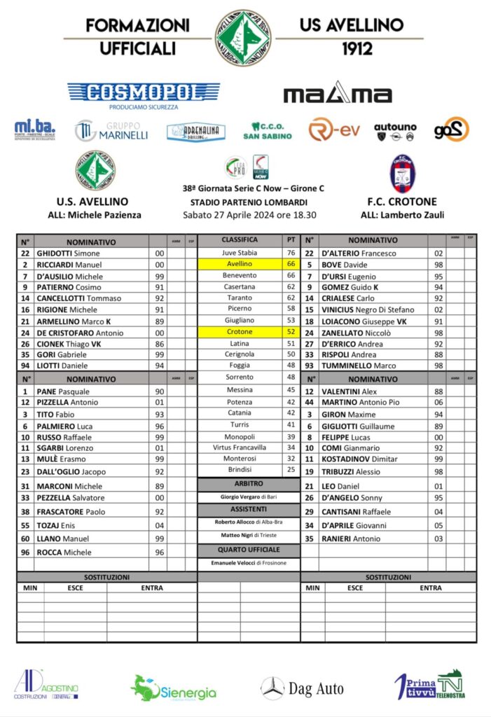 continua su Avellino Zon Avellino-Crotone, i convocati di Mister Pazienza